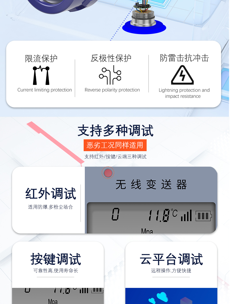 基于CAT1技术的无线雷达液位计,颠覆了传统雷达水位计的结构,采用一体化结构,内置高容量工业锂电池,可定时通过TCP透传至目标服务器,也可报警时触发上传,主要应用在河道液位测量,泥石流检测,污水管网,山洪预警等领域